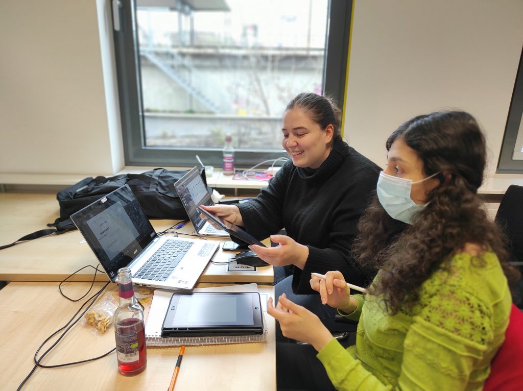 Währenddessen arbeitet unser Designteam hart daran, das Logo und das Raumschiff zu gestalten. Aus Zeitgründen haben sie sich dazu entschieden, lediglich ein Schriftlogo mit den ersten beiden Buchstaben der Bloody Mary zu gestalten. Die Zeit für die Skizze wurde verkürzt, um sie auf das Logo zu konzentrieren. Das Problem ist, dass beide Designerinnen sich nicht mit InDesign auskennen, aber es für dieses Projekt verwenden. Wir haben nicht die Zeit, uns Tutorials anzusehen.