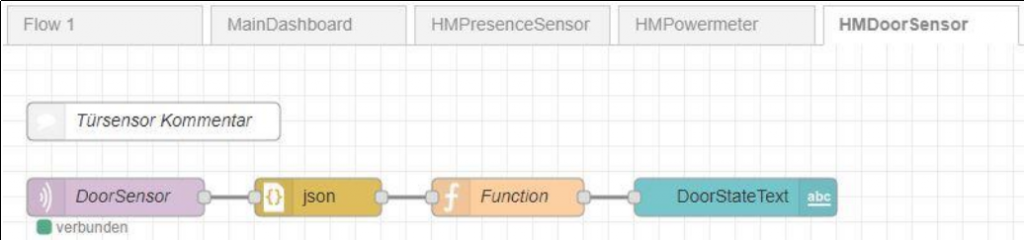 Die Erstellung von Funktionsabläufen geschieht in sogenannten Arbeitsblättern/Flows. Durch Drag & Drop von einzelnen Bausteinen, sind deshalb einfache Abläufe schnell erstellt. Somit lässt sich der Tür-Sensor von HomeMatic mit lediglich vier Nodes umsetzen (Abb. 3).