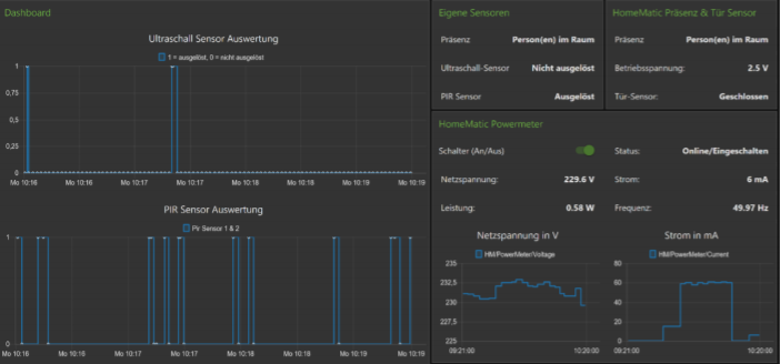 Für das Projekt wurden einerseits HomeMatic Produkte und andererseits Eigenbau Sensoren verwendet. Ein HomeMatic-IP Präsenzmelder ist für die Anwesenheit von Personen durch die Erfassung feinster Bewegungen im Einsatz und ein HomeMatic Türsensor stellt fest, ob beispielsweise eine Tür geöffnet oder geschlossen wurde.