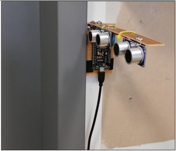 Analog zum PIR-Sensor wurde auch ein Ultraschallsensor umgesetzt. Zwei HC-SR04 Sensoren errechnen 10 mal in der Sekunde die aktuelle Entfernung zur nächsten Oberfläche aus der Echozeit. Passiert nun eine Person dieses Messfeld, ändert sich folglich die Entfernung signifikant. Man kann nun aus den Daten in Node-RED ablesen, welcher Sensor zuerst ausgelöst hat. Abschließend kann die Logik der Software also bewerten, ob die Person den Raum betreten oder verlassen hat.
